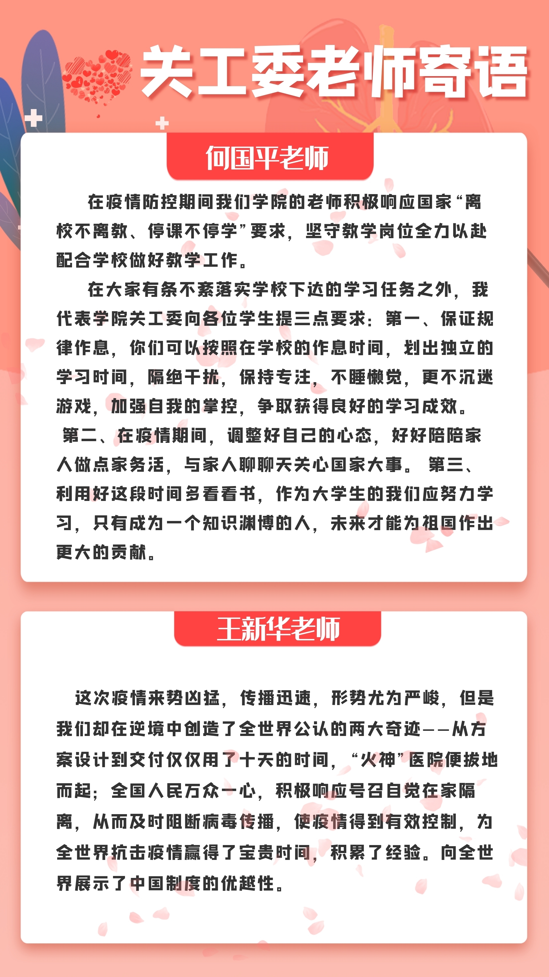 除了有效利用好学校党校提供的视频微课、学习强国提供的纪录片、培训班内进行的学习研讨之外,学员们有幸在结业典礼时聆听到了来自关工委老师的深情寄语。“保证规律作息,划出独立的学习时间,隔绝干扰,保持专注,加强自我的掌控,争取获得良好的学习成效。在疫情期间,调整好自己的心态,好好陪陪家人做点家务活,与家人聊聊天关心国家大事。利用好这段时间多看看书,作为大学生的我们应努力学习,只有成为一个知识渊博的人,未来才能为祖国作出更大的贡献……”寄语的字里行间满含老师们暖心的关怀和殷切的嘱托,激励着学员们,不断努力砥砺前行,为党和人民的事业迸发出新时代青年的活力。结业典礼的最后,304永利集团专职党务干部于童老师寄语全体积极分子,作为积极分子,依旧要以党员标准严格要求自己,抓住机会不断学习,保持自身的先进性。