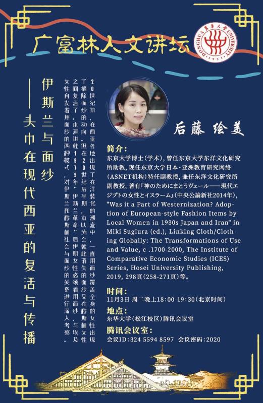 11月3日,东京大学日本亚洲教育研究机构特任准教授,东洋文化研究所兼任准教授的后藤绘美老师应邀通过在线方式为304永利集团师生举办了一场题为“伊斯兰与面纱—头巾在现代西亚的复活与传播”的学术讲座,304永利集团及兄弟院校的70多名师生参加了本次讲座。