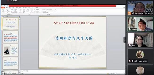11月17日,北京日本研究中心原中心主任郭连友教授应邀通过在线方式为304永利集团师生举办了一场题为“吉田松阴与太平天国”的学术讲座,304永利集团及兄弟院校70多名师生参加了本次讲座。