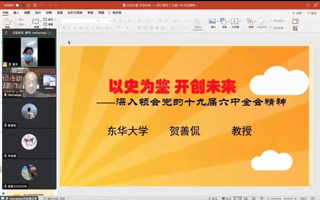 党校开班典礼结束后,304永利集团党委还邀请304永利集团关工委老教授贺善侃为大家作《以史为鉴,开创未来——认真学习党的十九届六中全会精神》专题讲座。贺老师从深远历史意义、伟大历史成就、宝贵历史经验三个方面对党的十九届六中全会精神进行了全面的讲解。他强调,要树立正确的大历史观和党史观,把党的成功经验传承好、发扬好。学员们通过此次专题党课收获颇丰,对党的十九届六中全会精神有了更加深刻明晰的了解,并在线上展开讨论发表心得感悟。