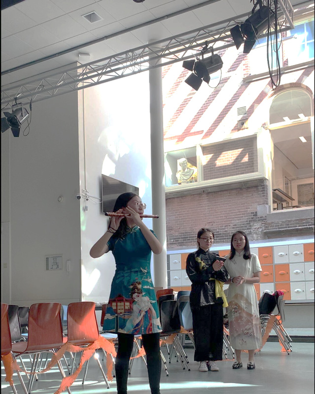 我院模拟联合国协会成员代表唐嘉玲在地球村活动中进行竹笛演奏