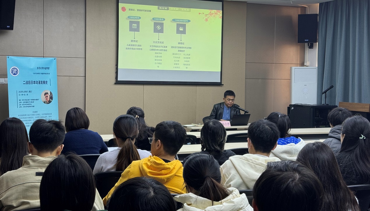 讲座中,马场公彦老师从概论篇、历史篇和主题篇三个方面介绍了战后日本动漫的发展趋势、特点、漫画研究等方面的内容。首先,在概论部分,马场老师绘制了多条时间线具体清晰地讲解了战后日本漫画的发展走向、受众变化以及近现代日本学界对漫画论、漫画研究的发展历程,并对中日动漫的发展历史、表现形式以及传播媒介等进行了比较。在历史篇部分,马场老师细致详实地讲述了二战后日本漫画的发展演变以及对大众文化的影响。马场老师认为,二战后初期是日本故事漫画的源头;1970年代,日本漫画进入成熟时期;1980年代漫画市场不断扩大,逐渐得到全民的认可;1990年代,日本漫画进入飞跃时期,同时日本动漫也在这一时期逐渐走出国门,实现全球化的传播。在主题篇部分,马场老师将日本漫画和动漫分为妖怪、科幻、体育、前卫、少女和社会等16个系列,不仅生动具体地解读了每个系列的风格及其影响,并且选取代表作的经典片段进行展现。其中,马场老师特别强调,作为日本现代动漫之父的手冢治虫早年因深受中国动漫《铁扇公主》的影响,于1967年创作出《悟空大冒险》这一中国元素极为浓厚的动漫。1988年中日合作的动画片电影《不射之射》亦是两国在动漫领域互相交流学习的丰碑式作品。
