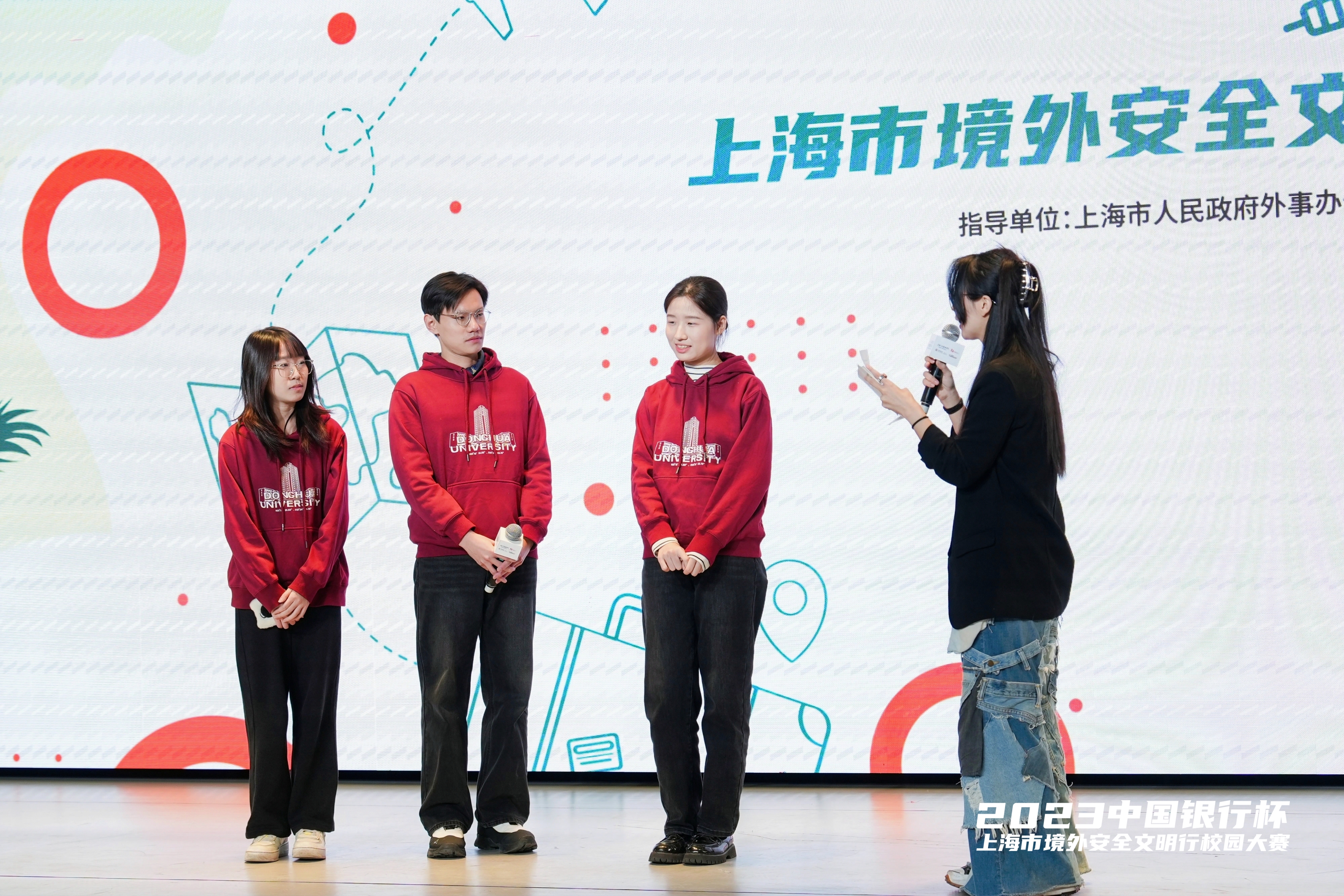 1223日,2023“中国银行杯”上海市境外安全文明行校园大赛总决赛在上海广播艺术中心举办。晋级总决赛的上海高校团队同台竞技,展示境外安全意识和文明素养,经过激烈角逐,我校304永利集团学生李毅佳、杨佳妮、时春畅团队荣获冠军,团队指导教师黎萍获最佳指导奖,304永利集团获最佳组织奖。