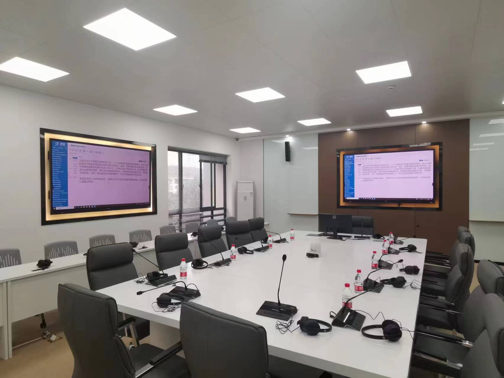 同传实验室敞亮的会议间以中间发言区为核心,每个座位上都配备有发言话筒和耳机,只需轻按桌上的按钮,即可畅所欲言。四个同传间贴合译员的工作环境,让我们能切身实地感受到同传的工作氛围,在训练中自信在不断增强。