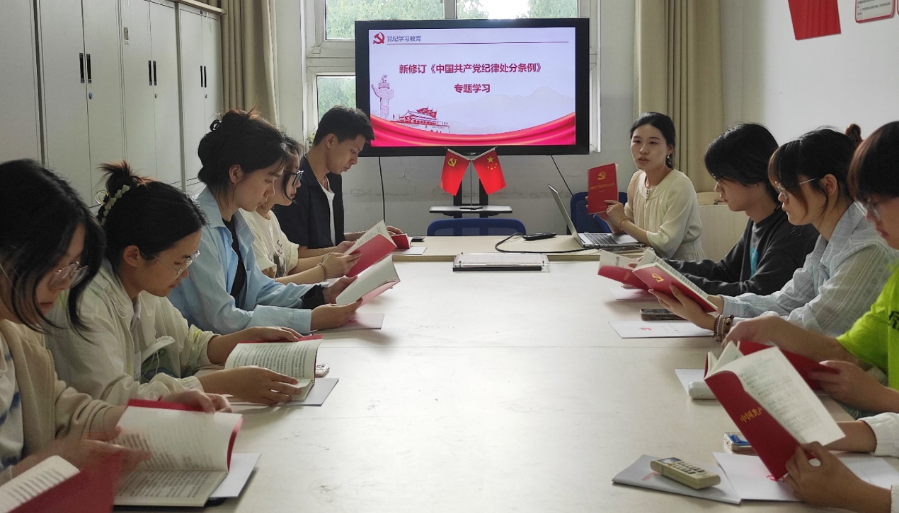 学生党支部全覆盖组织《中国共产党纪律处分条例》专题学习,全体党员原原本本学,逐章逐条学,明确行为的准则和底线,时刻提醒自身常怀律己之心;师生共同开展“六项纪律大家谈”交流分享会,联系学习生活和个人实际深入交流,通过“学、研、悟”,做到“懂、通、实”;举行党员大会集中观看警示教育片,以案为鉴、以案促学,筑牢思想道德防线;拓宽学习教育辐射面,组织全院学生共上一堂“网络生活中的行为规范”主题班会,并学习《学生宿舍(公寓)管理办法》等,持续规范网络和生活行为。