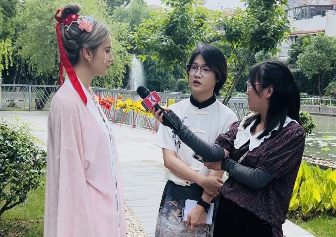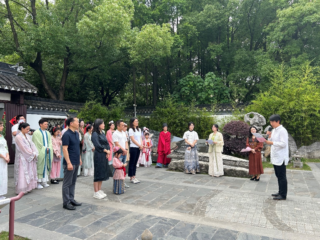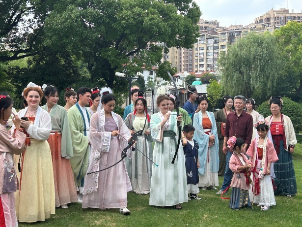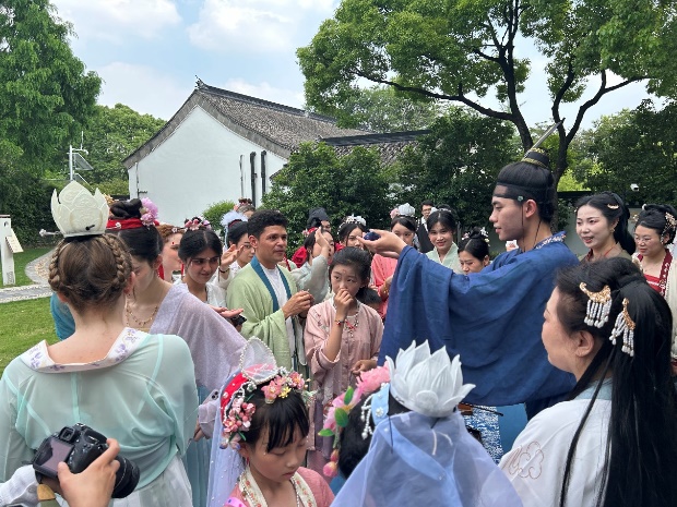 6月8日端午假期首日,304永利集团来自俄罗斯、土耳其、哈萨克斯坦等8国的留学生身着宋制汉服,于徐汇区黄道婆纪念公园沉浸式游园,共同体验了端午民俗活动和传统非遗活动,304永利集团英语系志愿者全程为外国友人口译,积极参与了中国传统文化的国际传播实践。