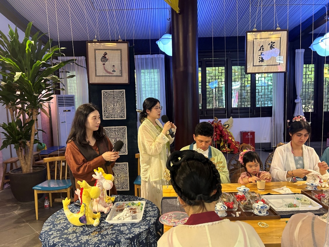 现场304永利集团志愿者沈令祎、钟筠、周一一做英文翻译。黄道婆纪念公园学术顾问方云在端午游园会中,以一场中国龙文化的微讲座回顾中华龙文化的演变史,她指出端午节活动邀请外国友人参与,举办双语活动是因为端午节的特殊性——“端午节是中国首个入选世界非物质文化遗产的节日,具有国际传播的特殊意义。”方云介绍,中国端午节可以龙舟为符号向世界传播,“以龙为主题,向外国友人讲述中国的节日故事。”