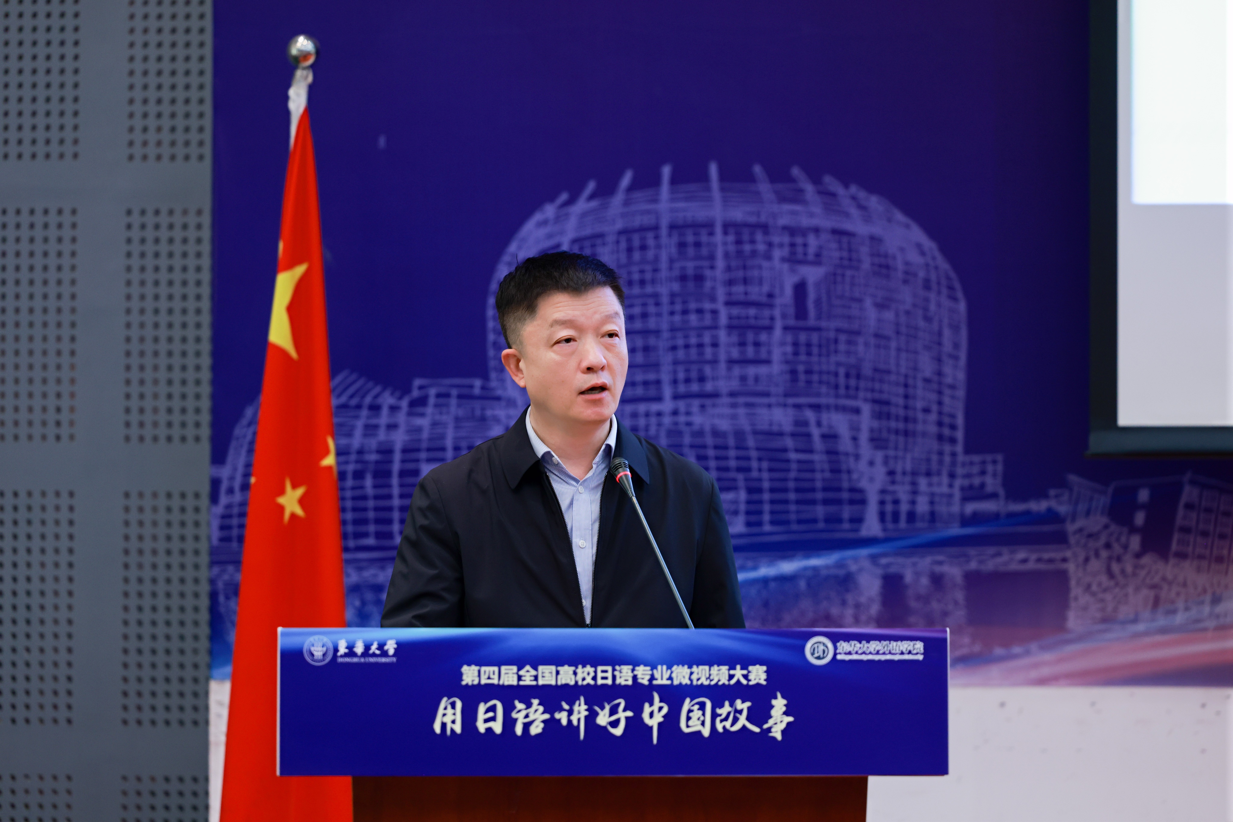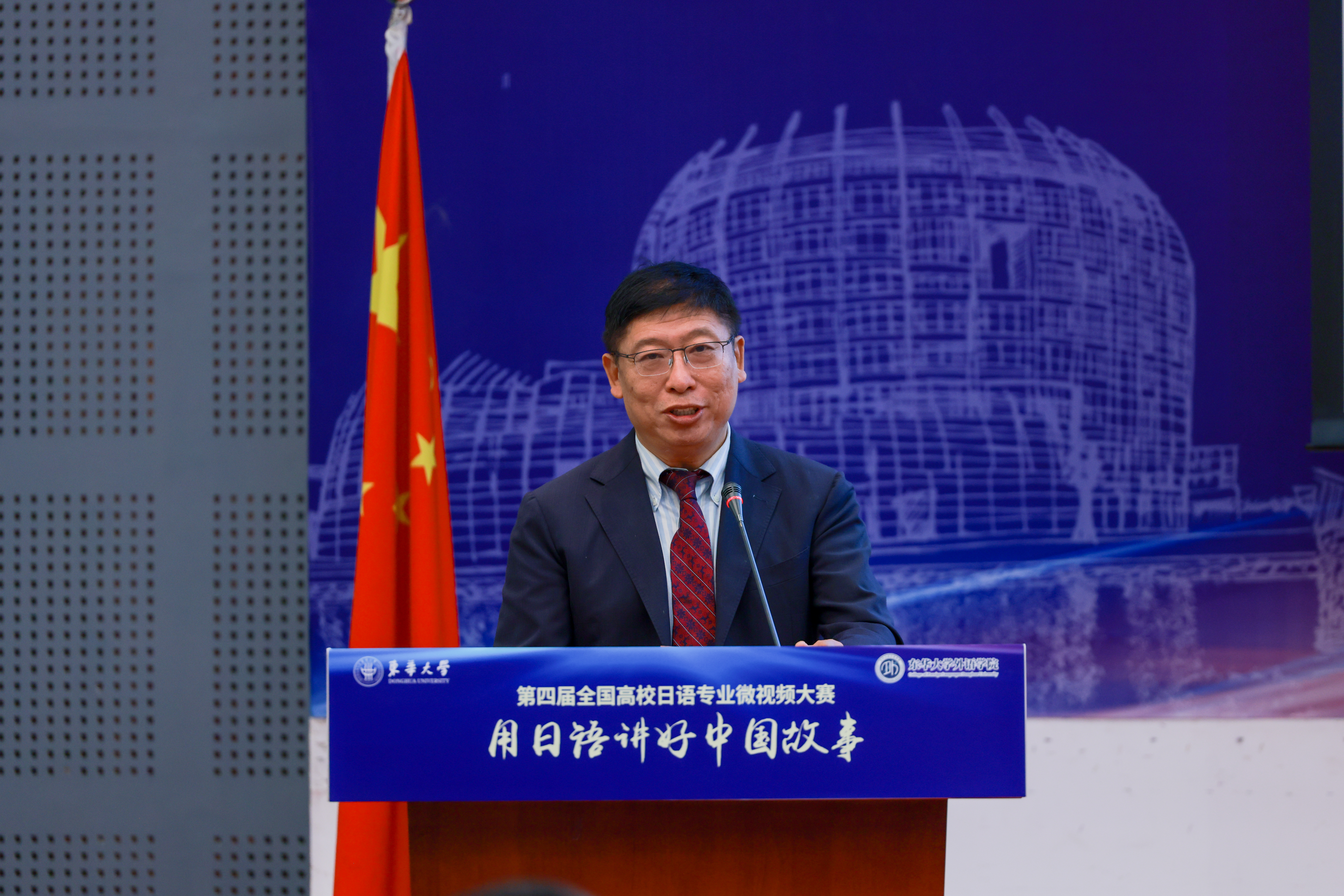 陈多友宣布比赛规则。本次大赛自报名工作启动以来,得到了全国各地多所院校的大力支持,共收到54所学校的参赛作品。初赛以“假如有一台时光机”为主题,以日语讲述中国的历史、文化或未来发展。各高校参赛作品主题明确,视角新颖,原创性强,呈现出多样风格和创意。决赛以“我眼中的新国潮”为题,全国日语专业学生发挥日语专业技能和新媒体传播手段,创作了内涵丰富、创意十足的微视频作品,充分展现了学生的日语实践能力和对中华优秀传统文化的深厚理解。